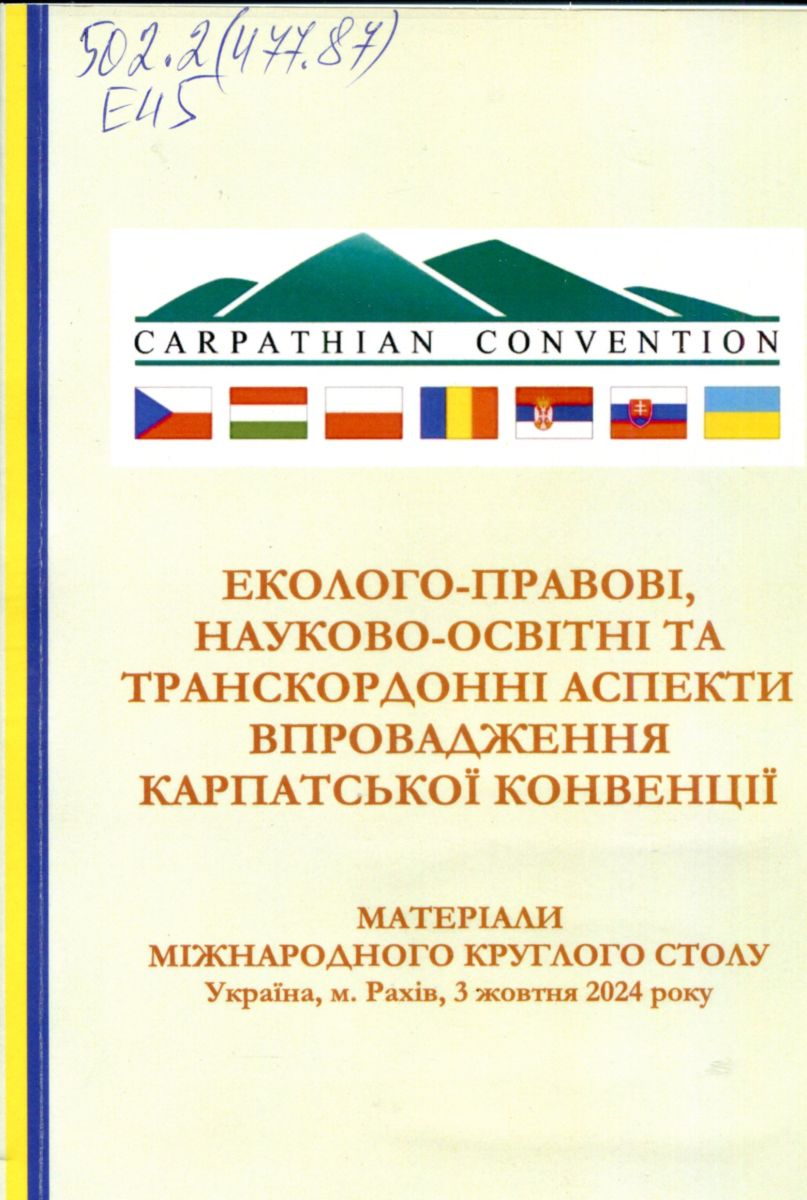 Еколого-правові, науково-освітні та транскордонні аспекти впровадження Карпатської конвенції та протоколів до неї : матеріали Міжнар. круглого столу, Україна, м. Рахів, 3 жовт. 2024 р. / Ю. Ю. Беркела, Ю. Л. Бошицький [та ін.] ; відп. ред. Ф. Д. Гамор ; пер. І. Д. Йонаш ; М-во захисту довкілля та природ. ресурсів України, Закарпат. обл. військ. адмін., Карпат. біосфер. заповідник, Ін-т екології Карпат НАН України, Київ. ун-т права НАН України. – Ужгород : ФОП Сабов А. М., 2025. – 474 с. : іл., табл. – Текст укр., англ. – Бібліогр. наприкінці ст.