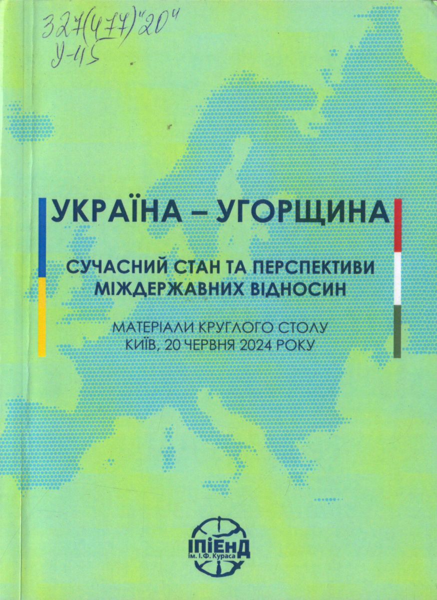 Україна – Угорщина: сучасний стан та перспективи міждержавних відносин: матеріали круглого столу м. Київ, 20 черв. 2024 р. / Ін-т політ. і етнонац. дослідж. ім. І. Ф. Кураса НАН України, Нац. ін-т стратег. дослідж., Ужгород. нац. ун-т [та ін.] ; за наук. ред.: О. О. Рафальський, В. О. Котигоренко ; упоряд.: О. Калакура, Р. Камінський, О. Ляшенко. – К. ; Ніжин : ІПіЕНД ім. І. Ф. Кураса НАН України, 2024. – 200 с. : табл.