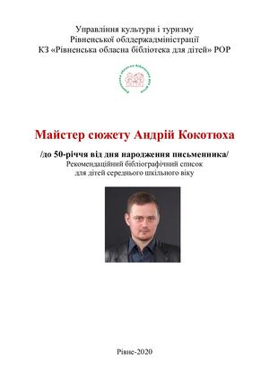 Майстер сюжету Андрій Кокотюха [Електронний ресурс] : до 50-річчя від дня народження письменника : рек. бібліогр. список літ. / Рівнен. обл. б-ка для дітей ; уклад. М. Романова. – Рівне, 2020. – 10 с. – Режим доступу : https://uhb.chl.kiev.ua/images/uploaded_files/mbm/1481/pdf/1481.pdf Видання вміщує біографічну довідку, перелік ресурсів в мережі інтернет про життєвий і творчий шлях письменника, анотований список художніх творів А. Кокотюхи, що знаходяться у фонді Рівненської обласної бібліотеки для дітей. |