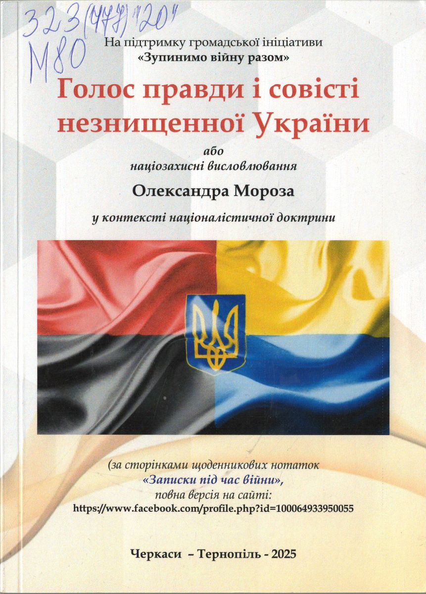 Мороз, Олександр Олександрович. Голос правди і совісті незнищенної України або націозахисні висловлювання Олександра Мороза у контексті націоналістичної доктрини : (за сторінками щоденникових нотаток "Записки під час війни") / О. О. Мороз, В. П. Неручок. – Черкаси ; Тернопіль : ФОП Осадца Ю. В., 2025. – 196 с. : іл, портр.