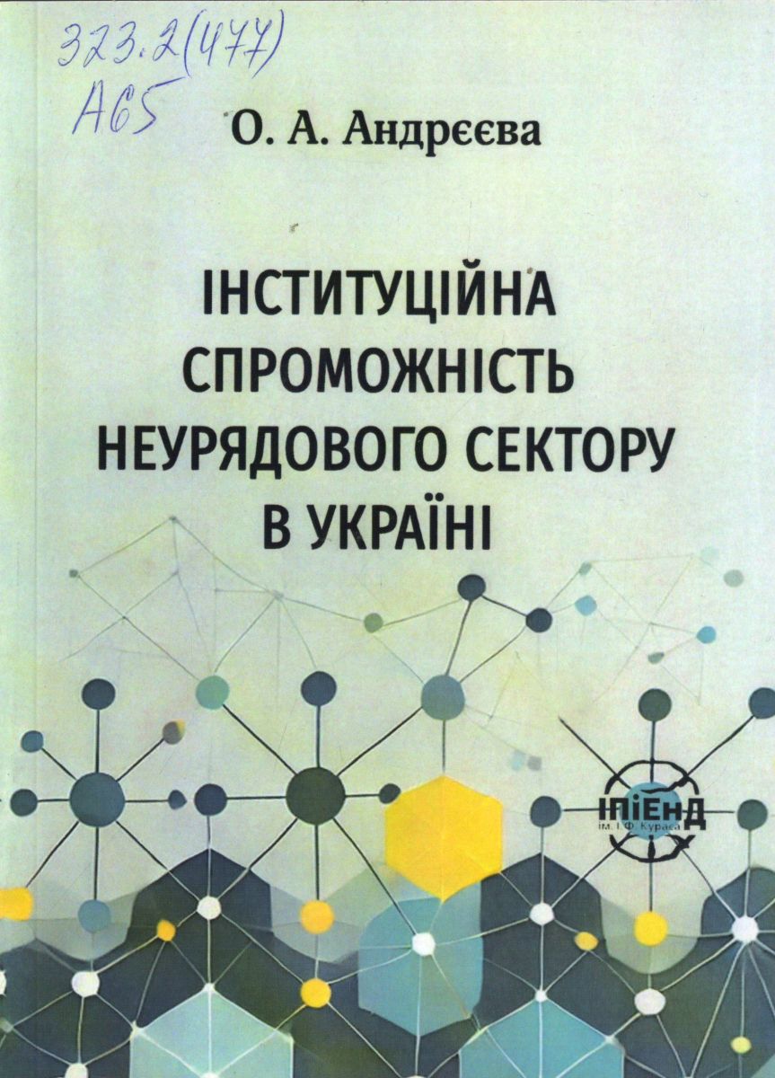Андрєєва, О. А. Інституційна спроможність неурядового сектору в Україні : монографія / О. А. Андрєєва ; Нац. акад. наук України, Ін-т політ. і етнонац. дослідж. ім. І. Ф. Кураса. – К. : ІПіЕНД ім. І. Ф. Кураса НАН України, 2024. – 112 с. : табл.
