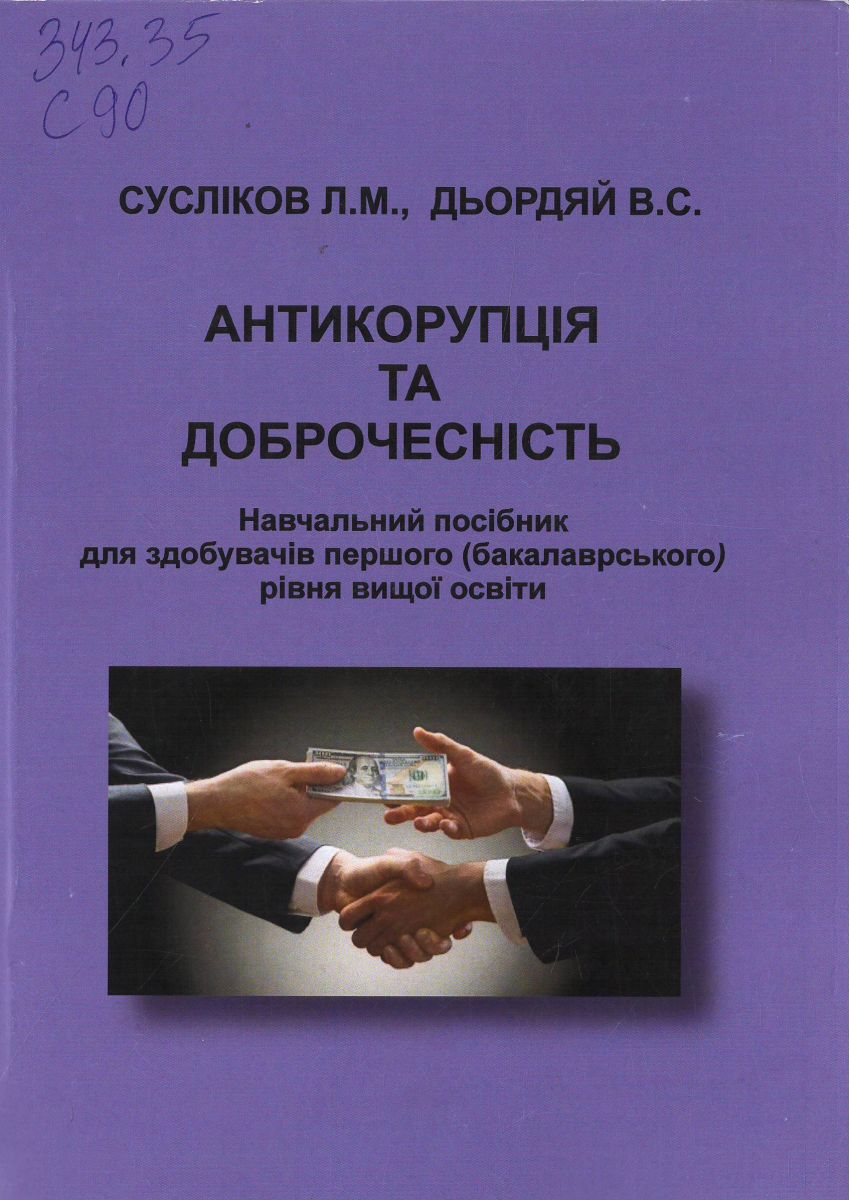 Сусліков, Леонід Михайлович. Антикорупція та доброчесність : навч. посіб. для здобувачів першого (бакалавр.) рівня вищої освіти / Л. М. Сусліков, В. С. Дьордяй ; М-во освіти і науки України, Держ. вищ. навч. закл. Ужгород. нац. ун-т". – Ужгород : Говерла, 2025. – 296 с.